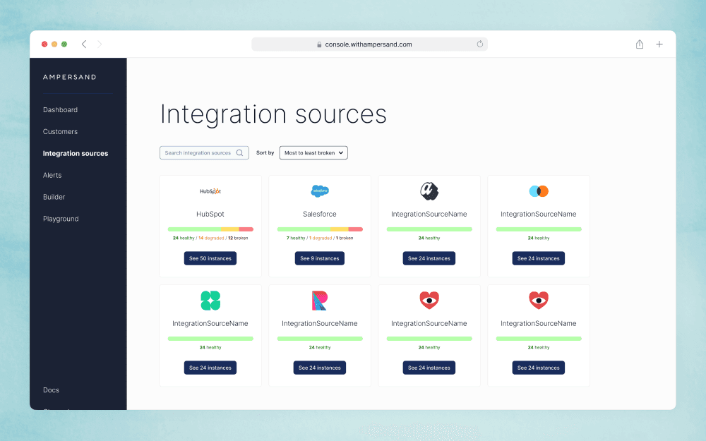 Every instance of an Ampersand-powered integration has two main attributes, the customer and the integration source (or provider, a term we switched to later).